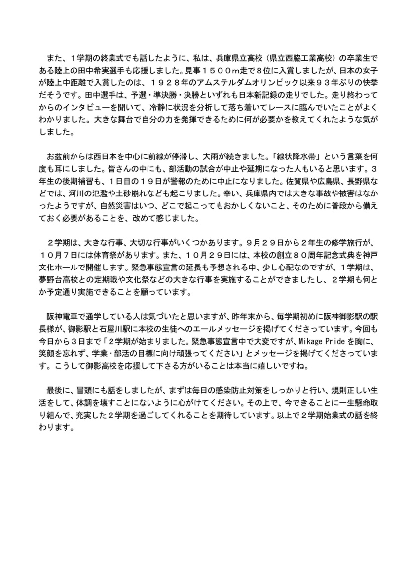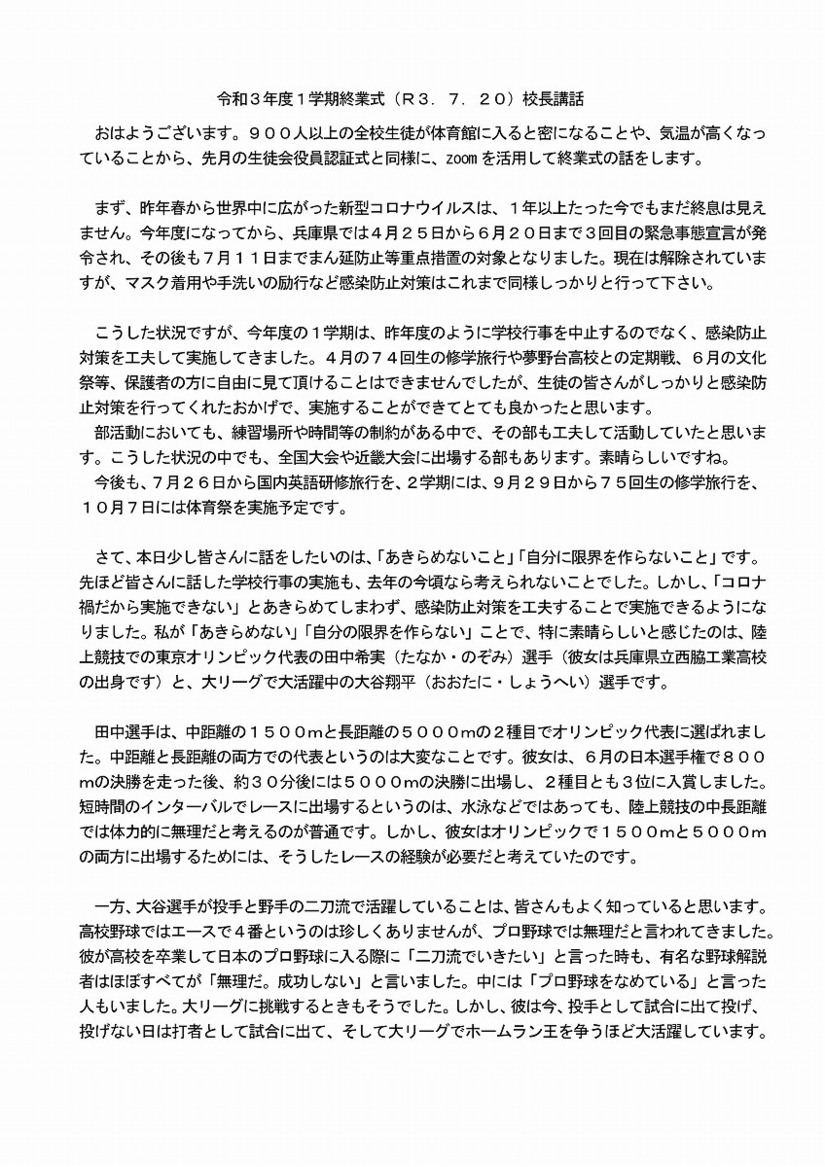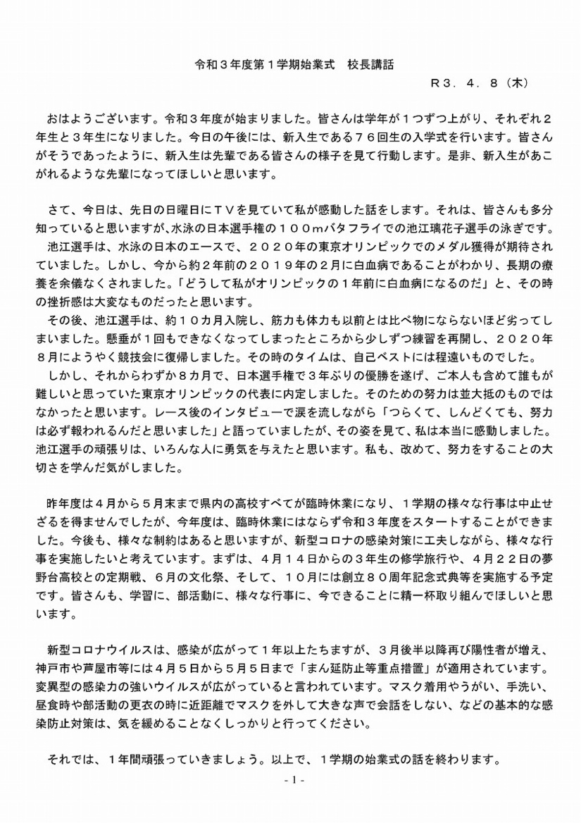 今年度(令和3年度)になっても、新型コロナウイルスの終息はまだ見えない状況ですが、様々な行事を中止ではなく感染防止対策を工夫しながら実施しています。必ずこの逆境を乗り越えることができると確信しています。