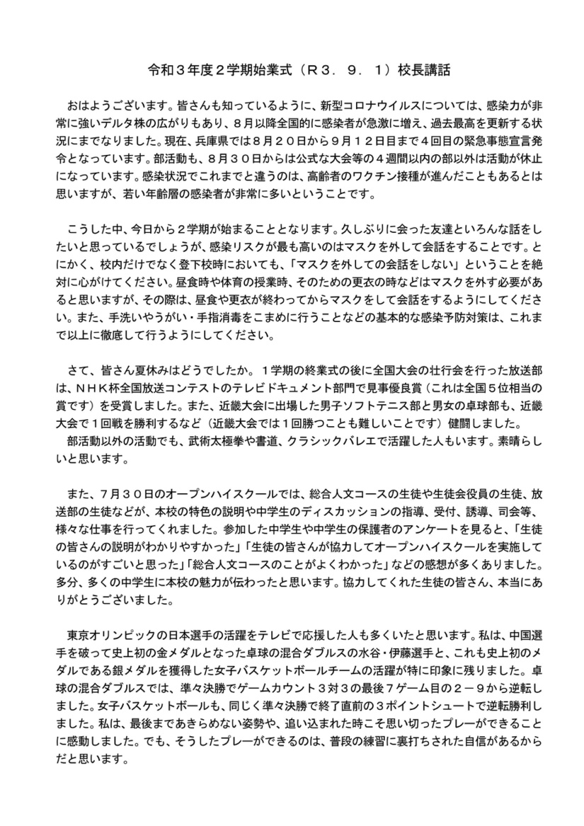 さて、この間、本校では校訓である「清く、明るく、正しく、強く」の精神のもと、心身ともに逞しい人間の育成を目指してきました。卒業生は、令和3年3月末で約3万7百人を数え、関西のみならず全国各地で活躍されています。