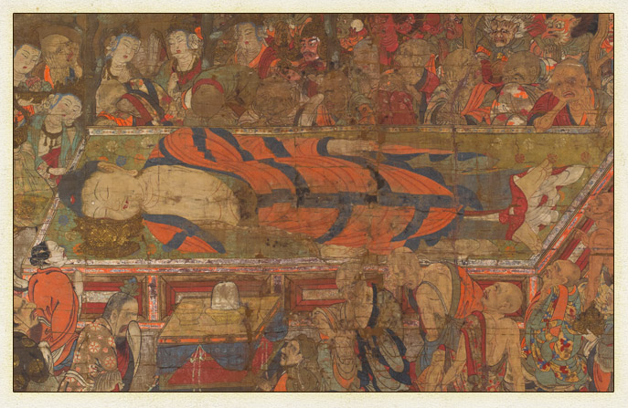 For example, the sala trees surrounding the bed are in four pairs, two for each direction of the compass, and are dry and bleached, resembling white cranes. Anuruddha, one of Gautama’s disciples, splashes water on Ananda, another disciple, who has fallen unconscious in agonizing grief. And an old woman prostrates herself in prayer holding the Buddha’s feet. These elements have their basis in the 40th fascicle of the Mahāyāna Mahāparinirvāṇa Sūtra and in its sequel.