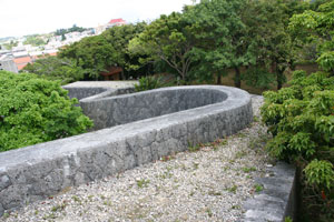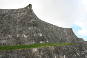ところで、もともと傾斜地の土留めの機能を託された石垣が、織豊期以降の本土の城郭では多用されるようになります。ただし、城地の自然条件も大きく異なるのでしょうが、沖縄の城(グスク)に見られる精緻な石加工と石積みによる曲線の城塁が、本格的に登場することはありませんでした。両者の発展形の違いに興味がもたれますが、本土の石垣の場合、折れ曲がりを直角の座標に整えるための算木積みの石組みが構築され、その上から睥睨する天守や櫓などの人目を惹く建造物と共に、仰ぎ見る者を圧倒しつつ周囲に見栄えの総合力を誇示し始めます。いわば、築城者の超越した権力を視覚表現する戦略のもと、石垣の柔和な連続「面」より、厳しく尖った「角」の部位の方に、城郭としての価値観が偏在しているのでした。片や、沖縄の石垣は、円弧状の曲線の情景が織り成す感覚により、自己主張を控えた、どこか受身の優しい印象が漂ってきます。しかしながら、図形の効用について原点に返って再考してみると、峨々とした算木積みに外敵を寄せ付けない造形の雰囲気を認めるとしても、実は稜線部の個々の築石では、直方体の六面のうちの各二面がいつも表出しているのであり、強度の面で大丈夫かと一抹の不安が過ぎるのです。