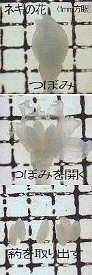 | * | 実体顕微鏡に1o方眼のシート(OHPシートにコピーしたものでも良い)をおき、その上でつぼみを開き葯を取り出すと、大きさが分かりやすい。 |