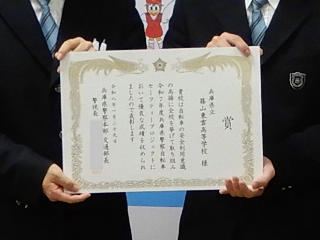 兵庫県警察の「自転車セーフティープロジェクト」に参加し、生徒代表が表彰状を受け取りました。