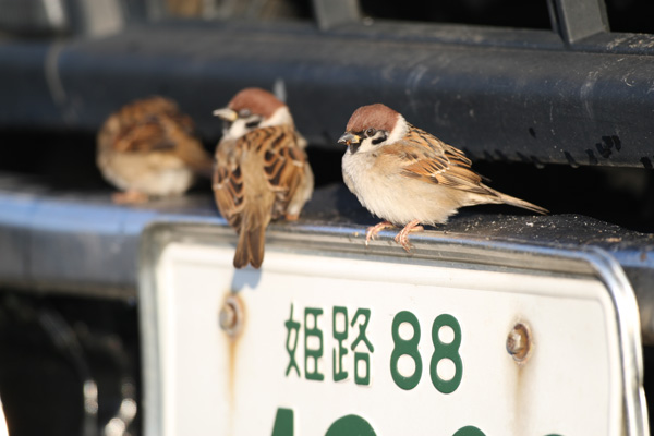 上の写真は、近くの鶏舎にニワトリの飼料を運んでくるトラックのバンパーでくつろいでいる様子です。トラックが到着すると、スズメたちはどこからともなく集まり、飼料のおこぼれをついばんでいきます。餌を運んでくれる便利な機械(トラック)はすっかりスズメたちの憩いの場になっています。