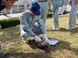 この授業は、兵庫県電気工事工業組合 淡路支部の皆様を講師としてお招きし、電気工事に関する実習を通して、生徒たちの理解を深めることを目的として行われました。 電気工事士の方から直接、技術的な指導を受けることで、生徒たちはより専門的な電気技術を学習する貴重な機会となりました。