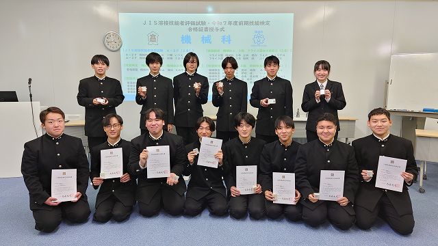 機械科の生徒が、国家資格であるJIS溶接技能者評価試験A-2Fに2名、技能検定では機械加工普通旋盤作業2級に1名、3級に4名、フライス盤作業3級に2名、機械検査作業3級に5名が合格し、合格証書を授与していただきました。