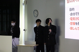 令和6年度課題研究発表会が本校多目的教室にてオンラインで行われました。1月22日(水)の各科の課題研究発表会で選ばれた全4講座(下記参照)の3年生の生徒が全校生徒の前で発表しました。それぞれの講座の発表後、Googleフォームでアンケート、質疑応答をし、1,2年生は各HR教室で真剣に発表を見ていました。 1.地域メディアデザイン(地域商業科) 2.出前工作教室(機械科) 3.電池の研究(電気科) 4.プロジェクションマッピング(地域商業科)
