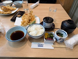 青い月明かりのなか夕食会場に向かいました。丸ごとおいしさが伝わる天麩羅を食べました。皆ご飯が進みおかわりをよくしていました。