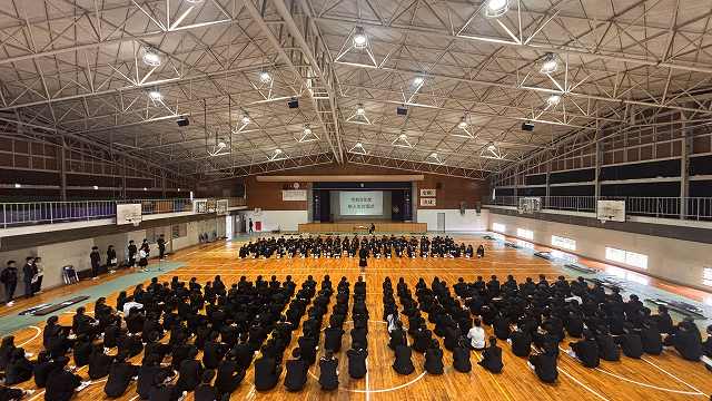 本日、新入生と2・3年生が初めて一堂に会する令和8年度対面式が開催されました!最初は少し緊張気味だった1年生も、先輩たちの明るい歓迎を受けて、次第に笑顔がこぼれるようになりました。在校生代表の生徒会長の挨拶をはじめ、学校の施設紹介や行事紹介を生徒会の生徒中心で行いました。