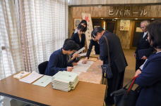 創立70周年の記念品として同窓会より「電動スクリーン・プロジェクター」一式が学校に寄贈され生徒会長がその目録を受け取りました。