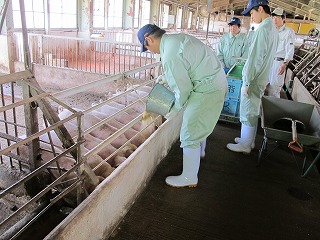 | 生活科では、2年生から畜産の総合実習・当番実習が始まります。大きな豚や牛に触れ餌を与えたり、除糞を行いました。みんな怖がることなく積極的に取り組んでいます。 | ||