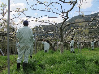 | 平成31年4月15日(月)、本校果樹園では梨の花が満開に咲き誇り、早速、2年生みのりと食科の生徒が受粉作業を行いました。品種は「新興」。11月の但農祭頃に収穫の時期を迎えます。美味しい梨がたくさん出来ますように!愛情を込めて育てます。 | ||