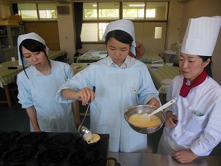 | 平成27年5月26日(火)、みかしほ学園(姫路市)の先生を講師に招き、3年生活科の生徒を対象に、ワッフルとコルネの作り方についてご指導をいただきました。NHK朝の連続テレビ小説「まれ」の影響もあって、世はスイーツブーム。但農生は食べるだけでなく、作ってもしまうもんね!。 | ||