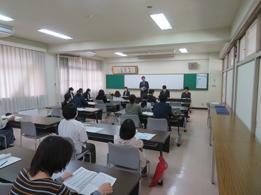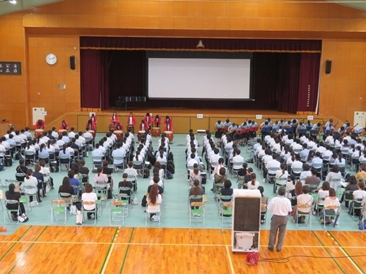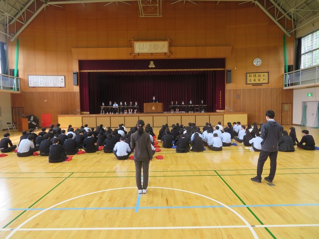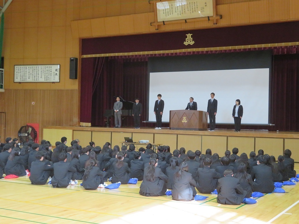 着任式では、新しく着任された 6名の教職員の紹介がありました。藤野浩司教頭先生、山口喜美恵先生(英語)、板谷恒平先生(理科)、松下竜大先生(地歴公民)、事務室の木山凌雅さん、中嶋秀彰さんです。代表して藤野教頭先生よりお話があり、学ぶことで成長できること、そのためにもみんなで協力していきましょうという着任の挨拶がありました。