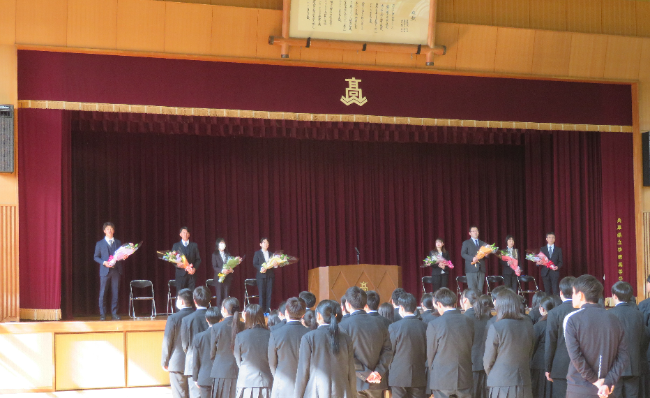 ))が来校され、夢前高校への熱い思いを語ってくださいました。最後に、生徒代表から先生方へ感謝の言葉が述べられ、花束が贈呈されました。