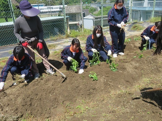 夢前高校の畑で、「生活と福祉」の授業を選択している生徒が中心となりサツマイモの苗を植えつけました。秋に、姫路特別支援学校の小学部の児童たちと一緒に収穫を予定しています。大きく育った芋を手に持ち、喜ぶ児童たちの顔が見られるといいですね。