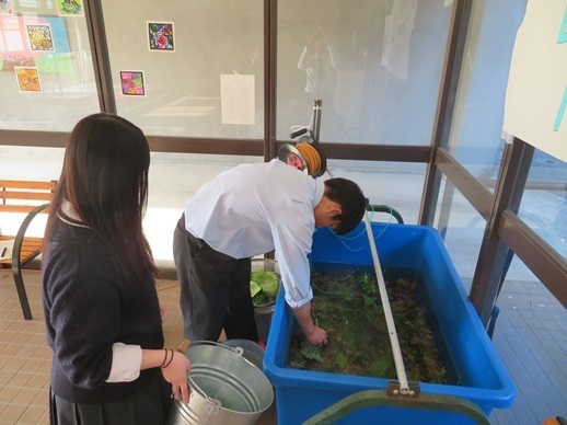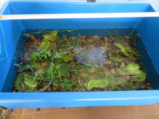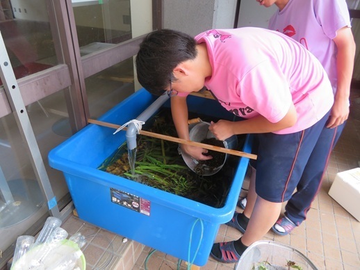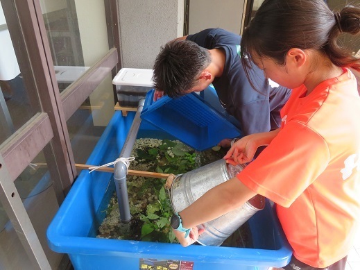 ホタル飼育水槽の清掃を30分以上かけて行い、学校近くの空き地に生えている草を採ってきてカワニナの餌として与えました。ホタル幼虫は1~