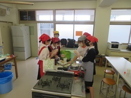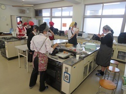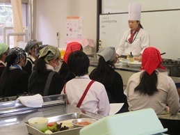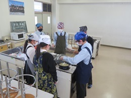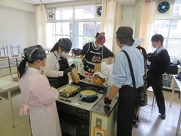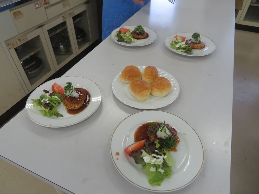 生活と福祉の授業を選択している生徒が、みかしほ調理専門学校の講師の方に、高齢者や幼児にもあった消化の良い豆腐ハンバーグの調理実習を開いてもらいました。豆腐はケイエスフーズ(株)に提供していただき、若手社員