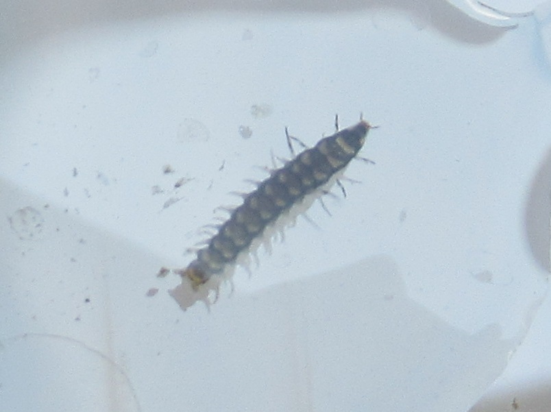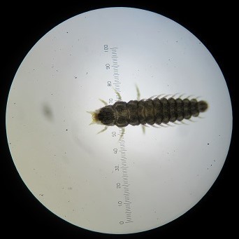 採集したホタルが産んだ卵からふ化した幼虫をカワニナの水槽に入れました。ふ化したばかりの幼虫は体調2