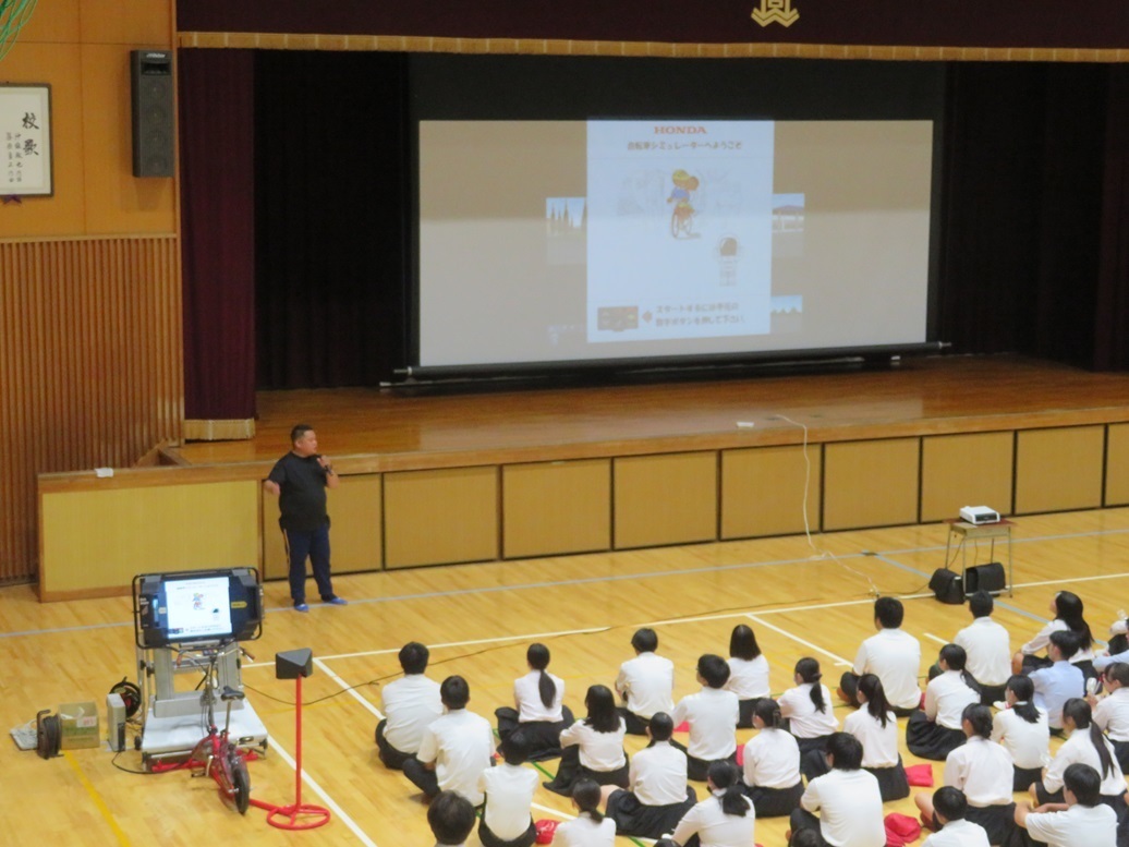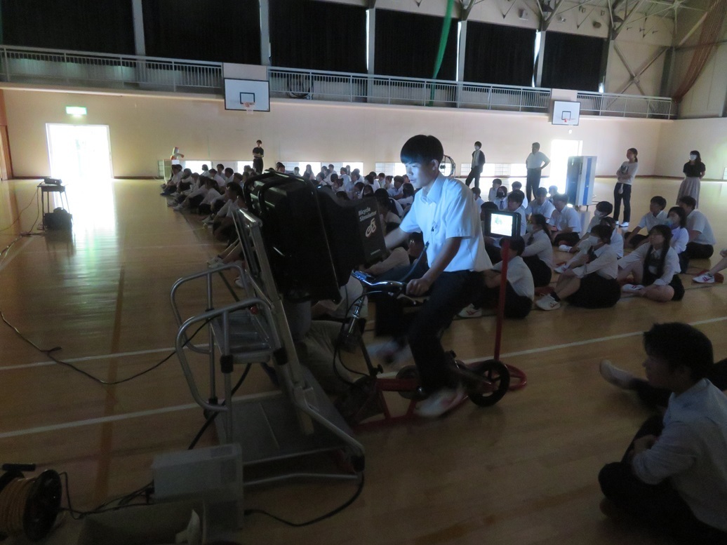 4時間目に福崎インター自動車学校の方を講師に迎え、交通安全講話を行いました。自転車運転シミュレーターを代表生徒が運転し、運転中の危険についてわかりやすく解説してもらいました。学校や塾などに通う道にもあらゆる危険が潜んでいることを実感することができたと感じます。その後、来年度から自転車運転にも罰金が科されることを話していただきました。交通ルールを守って安全に運転することの大切さを改めて確認した講演会となりました。