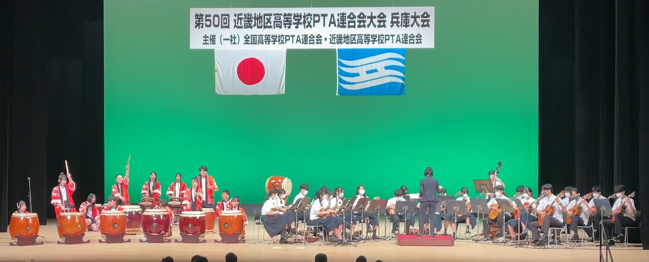 PTA連合大会兵庫大会にて、本校地域アクティブ類型の生徒が明神太鼓を披露しました。福崎・播磨福崎高校のギターマンドリン部とのコラボ演奏もあり、会場を盛り上げました。
