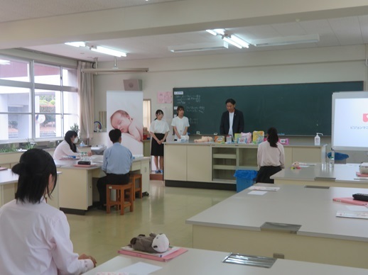 保育実践の授業では、ピジョンマニファクチャリング兵庫(株)の方から子育て家庭を支える商品について教えていただきました。肌にやさしい商品を実際に触れたり、水に溶ける商品を実験を通して体験しました。また、赤ちゃんの体重や抱き方を通して、保育学習をより深めることができました。
