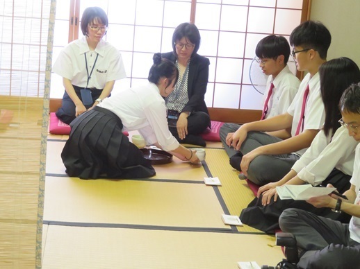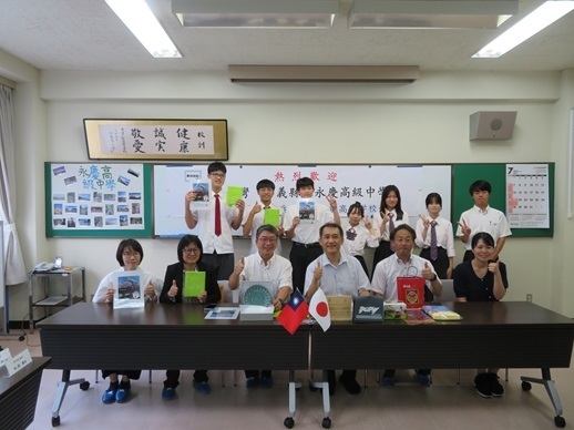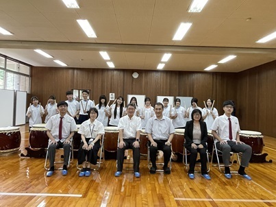 台湾の姉妹校永慶高級中學の生徒が来日し、夢前高校を訪れました。夢前高校生が演奏するゆめさき明神太鼓で歓迎セレモニーが行われ、お互いに記念品を交換して親睦を深めました。最後に茶道部がお点前を披露しました。