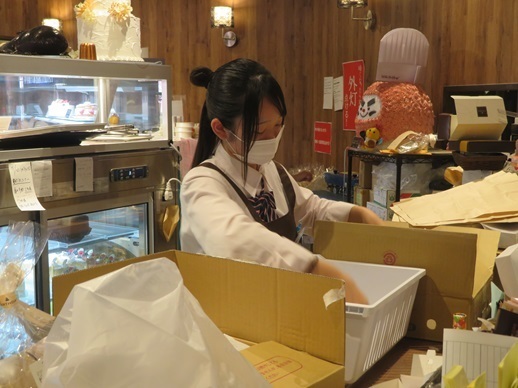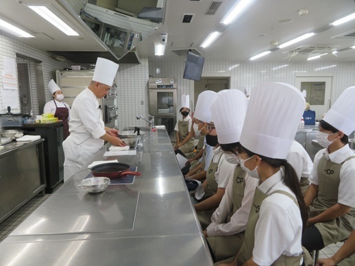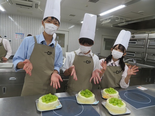 パティシエ部と進路選択として調理関係を考えている生徒を対象に夏季研修を行いました。当日は、14人の生徒が参加し、シャインマスカットケーキを作りました。中には白桃とアプリコットを挟み、夏らしく甘みと酸味のあるケーキができ、完成に全員満足しました。