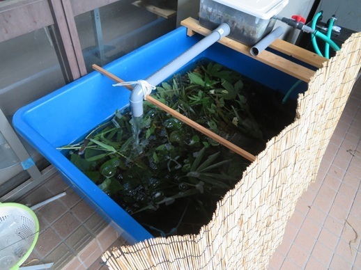 登校日だったので、生徒会数名と担当教師でホタル幼虫を飼育している水槽の掃除を1時間ほどかけて頑張りました。掃除中に