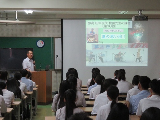 令和7年度の一学期もとうとう最終日です。大掃除をした後に視聴覚室で終業式が行われました。校長先生からは、夢前川のホタルの話や人の心の話がありました。心は脳の機能と大きな関わりがあり、脳の機能が現代の生活とあっていないことが心に違和感をもたらしているとのことでした。その後、校歌斉唱をして終業式が終わりました。