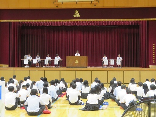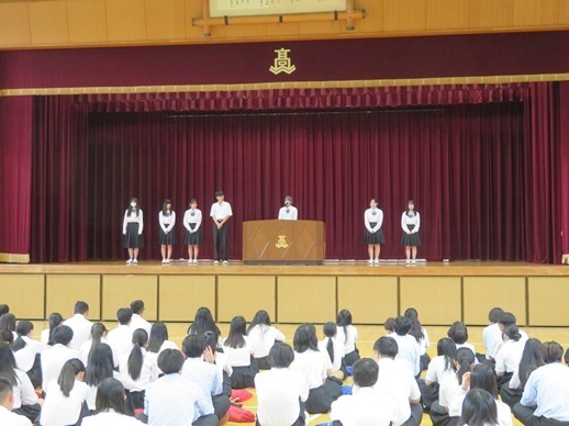 生徒大会がありました。初めに生徒会長の遊屋世那さんが「生徒会の活動について理解を深め、より良い学校となるよう協力して頑張りましょう」と挨拶をし、生徒会活動の行事予定や生徒会費予算、各委員会の年間目標などを生徒全員で審議しました。