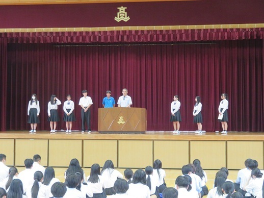 先日行った生徒会役員選挙の結果、新生徒会役員が決まり、その認証式が行われました。校長先生からは認証状が手渡され、旧生徒会役員への感謝の言葉と新生徒会役員への激励の言葉が贈られました。新生徒会長から「これからの学校生活をさらによりよくしていきたいのでご協力よろしくお願いします」と挨拶がありました。頑張ってほしいですね。