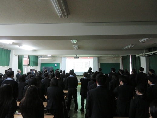 3学期の始業式が行われ、校長先生からは「幸せのかたち」についてのお話がありました。心が共鳴する人と時間を共にするときに幸せを感じることや、自分が勇気をもって心を開くことが幸せを手に入れるために必要なこと、自然景観や芸術に触れることでも幸せになれることをお話しされました。逆に幸せを奪うものとしてスマートフォンが会話を奪うこと、