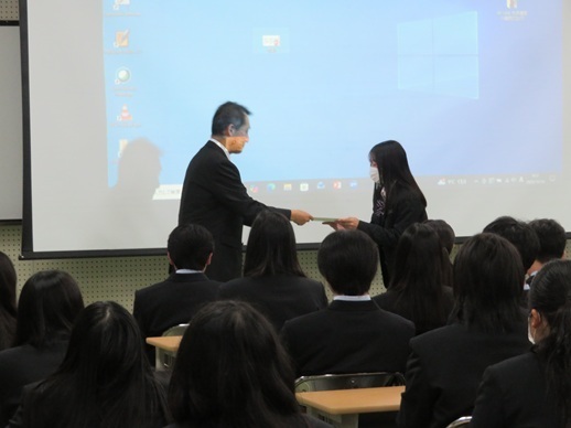 始業式後の表彰伝達では、情報処理の検定資格取得者が表彰されました。